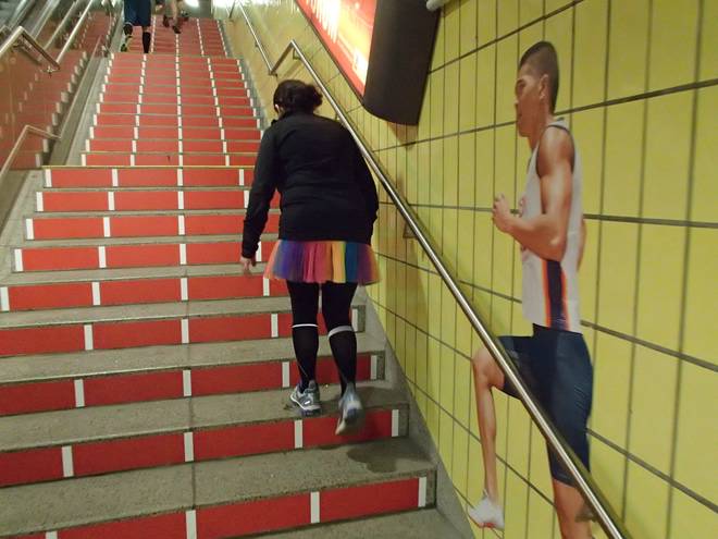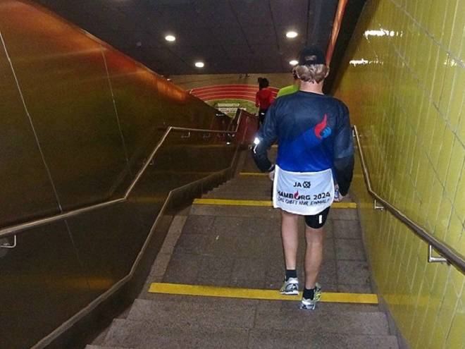 Runde 127 0.55 Uhr / Km 17,7 Und auf den Treppen mußte man ja auch aufpassen. Das bin ich von hinten. Die Olympia-Fahne hatte ich das ganze Rennen dabei. Foto: Christian |