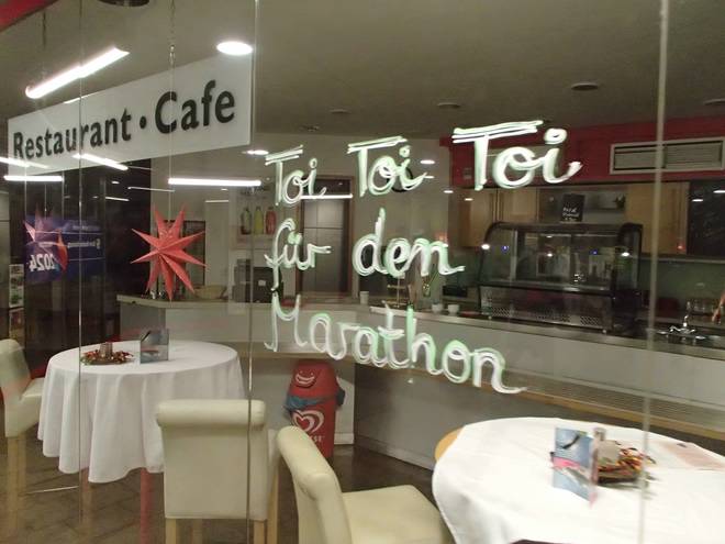 Runde 155 1.27 Uhr / Km 21,7 Grüße von den Läden der Rathaus-Passage an die Marathon-Läufer. |