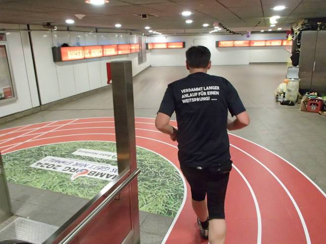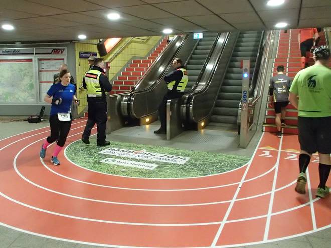 S-Bahn-Station Jungfernstieg Eine Laufbahn mitten in Hamburg. Da hätte man gar nicht erst noch einen Läufer an die Wand zu malen brauchen, um die Idee aufkommen zu lassen, hier zu laufen. |