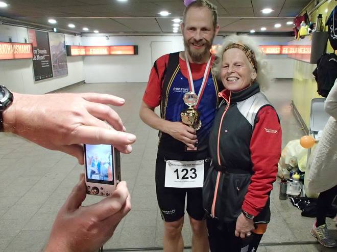 Runde 247 3.37 Uhr / Km 34,02 Nur 1:57 Minuten später kam Ulli Krastev ins Ziel. Lange Zeit hatte er geführt, war aber doch zu schnell angegangen und mußte Toni am Ende ziehen lassen. |