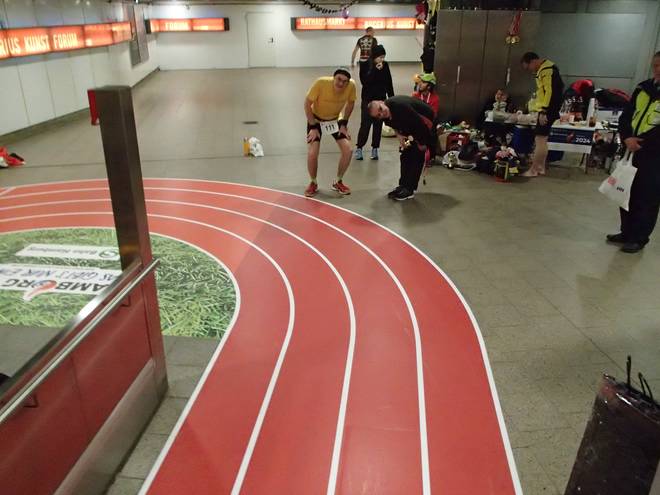 Runde 302 4.47 Uhr / Km 42,16 Die letzte Runde. Jetzt nur noch eine Kurve und einmal die Treppen runter. Inzwischen war es klar, daß mein Negativ-Rekord nicht gebrochen werden würde. Das war auf den 17. Januar 2016 verschoben. Dann würde beim Hochbunker-Marathon die Zeit mit Sicherheit fallen. |