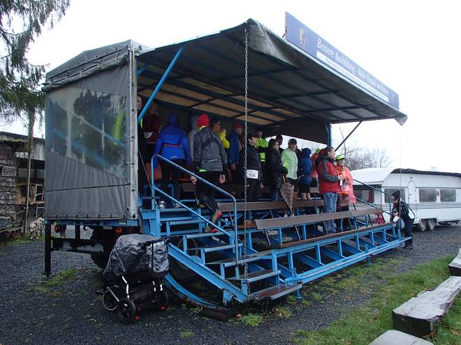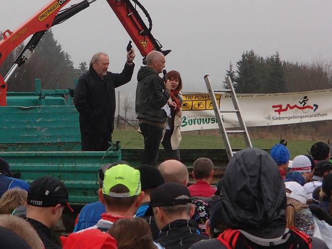 Gangpferdezentrum Peter-Staffel-Straße 10.00 Uhr Rasch noch ein paar Worte vom Veranstalter und noch einer Person. Aber verstanden hat man nichts. Egal. Hauptsache es ging nun endlich mal los. Naß werden schon vor dem Start ist echt ekelig. |