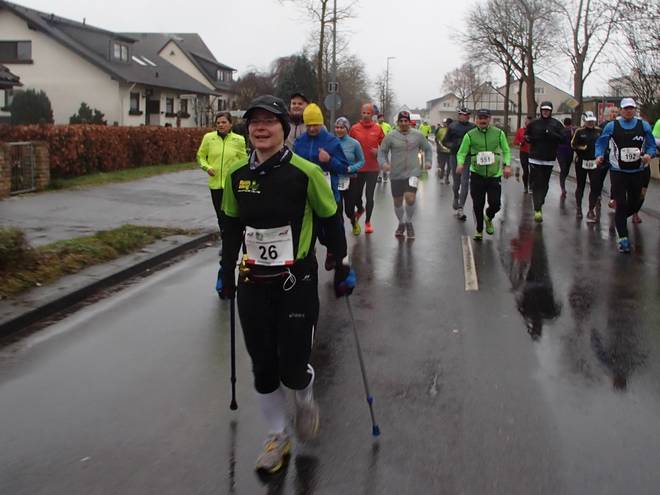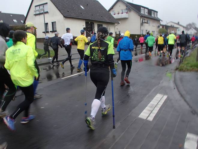 Aegidienberger Straße 10.05 Uhr / Km 0,6 Dafür aber mit... guck ich da richtig? Läuferin mit Krücken. Und nicht einmal besonders langsam. |