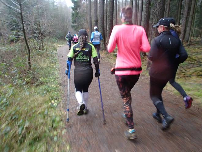 Am Markhövel 10.21 Uhr / Km 3,3 Da staunt man. Ich hätte ja die Vorteile bei Krücken eher bergauf erwartet, aber Bettina raste immer bergab an allen vorbei. So wie hier. Und das auch gerne mal über den unbefestigten Rand. |