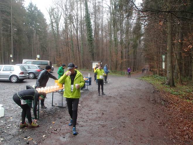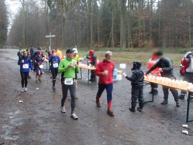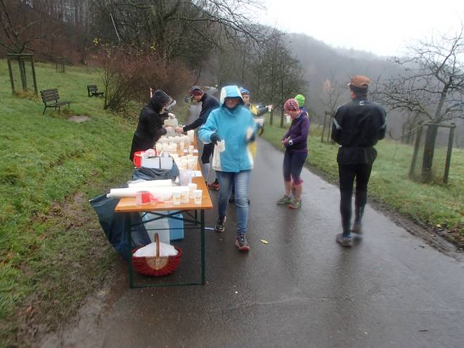 Löwenburger Straße 10.59 Uhr / Km 8,8 Verpflegungsstand Nummer 2 am Gasthaus Löwenburger Hof. Immer noch Regen. |