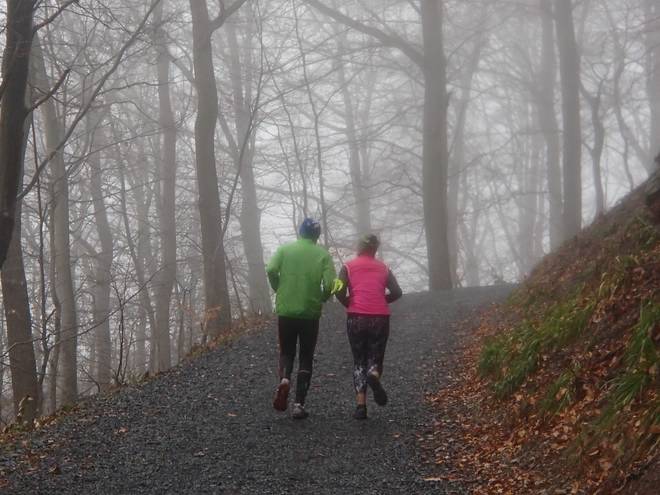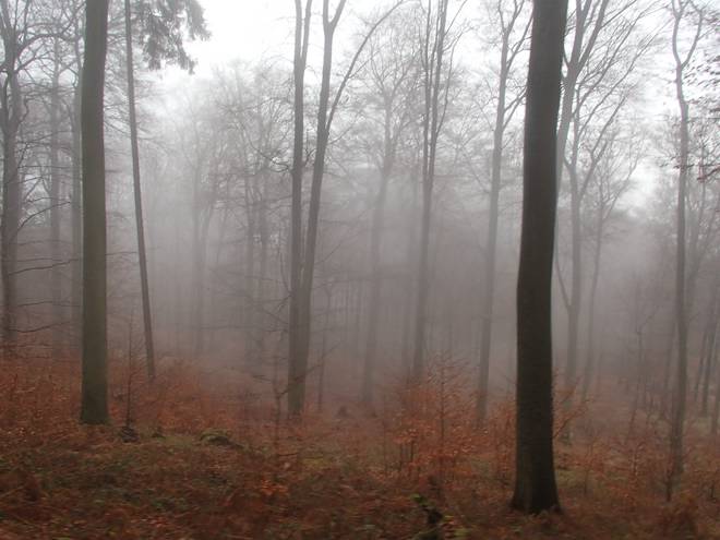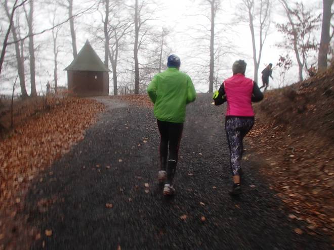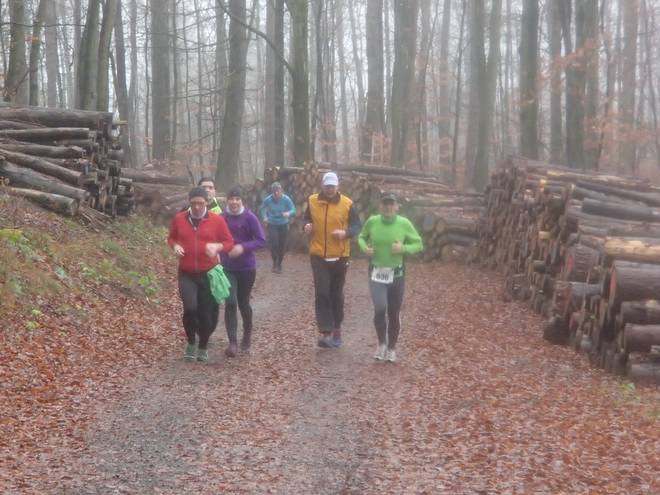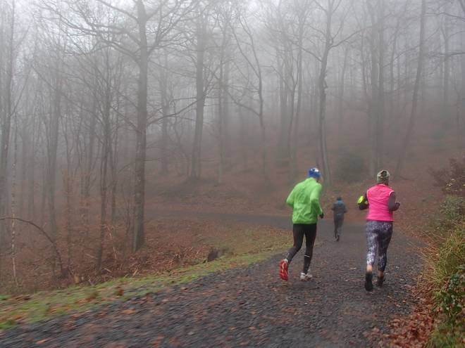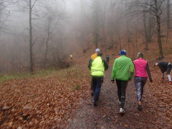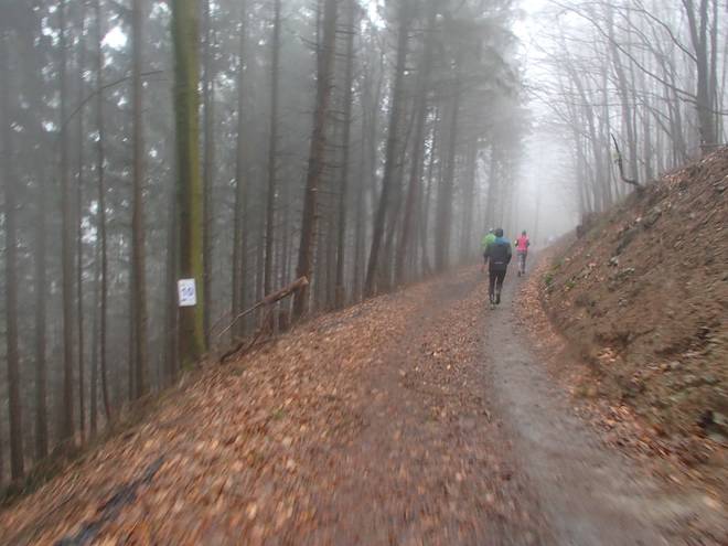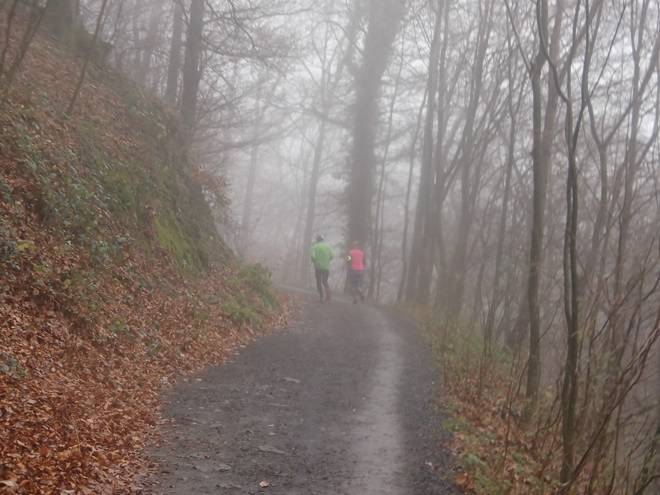 Drachenfels 11.00 Uhr / Km 8,9 Nun wurde es neblig auf der Strecke und auch spürbar kühler. Wir hatten nun doch einige Höhenmeter gewonnen. |
