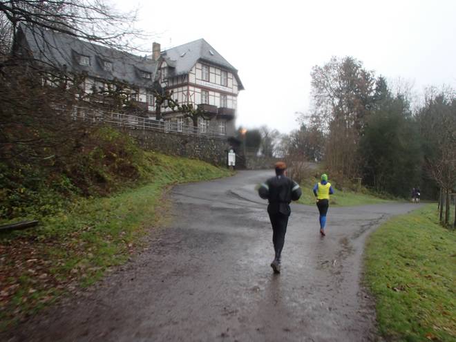 Löwenburg 11.29 Uhr / Km 13,5 Einmal waren wir wieder beim Löwenburger Hof vorbei gelaufen, nun ging es in die Runde um die Löwenburg. Die Burg selbst bekamen wir nicht zu sehen. Dafür hätten wir noch ein paar Höhenmeter extra machen müssen. |