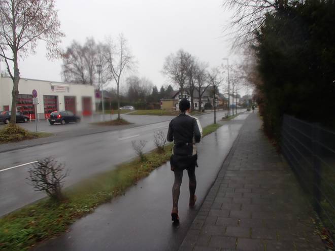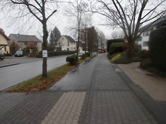 Hubertusstraße 14.22 Uhr / Km 40,5 Noch lief ich unbekümmert auf der Straße, mußte aber kurz danach feststellen, daß man sich auch im flotten Lauf nicht mit Autos anlegen sollte. Also ab auf den Bürgersteig. |
