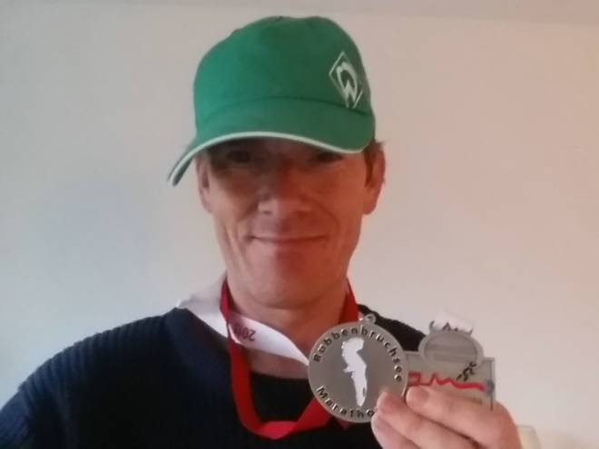 Hotel am Markt 15.04 Uhr Die Marathon-Medaillen Nr. 163 und 164. Neben den nassen Klamotten mußte ich auch die nasse Mütze wechseln. Aber ich hatte zum Glück noch eine weitere passende dabei. :-) |