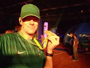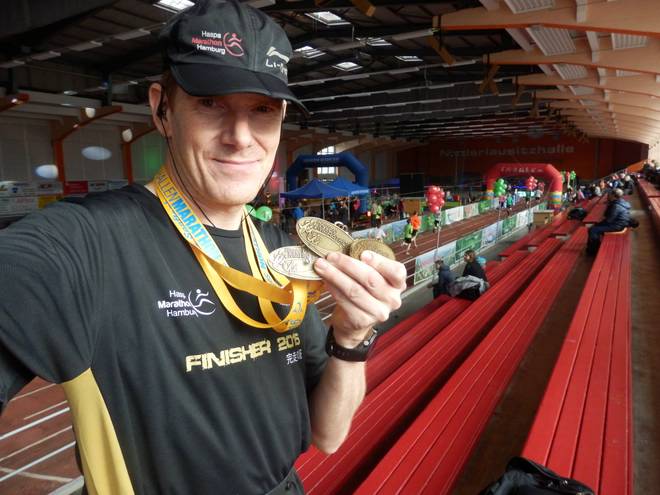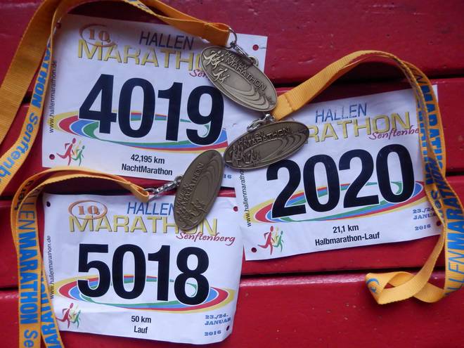 Niederlausitzhalle 24. Januar 2016 14.07 Uhr 15 Minuten nach dem Finish des 50-Kilometer-Ultra-Laufes. Meine drei Medaillen, die ich in 20 Stunden zusammen lief. |