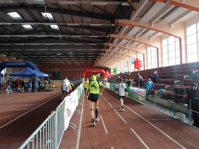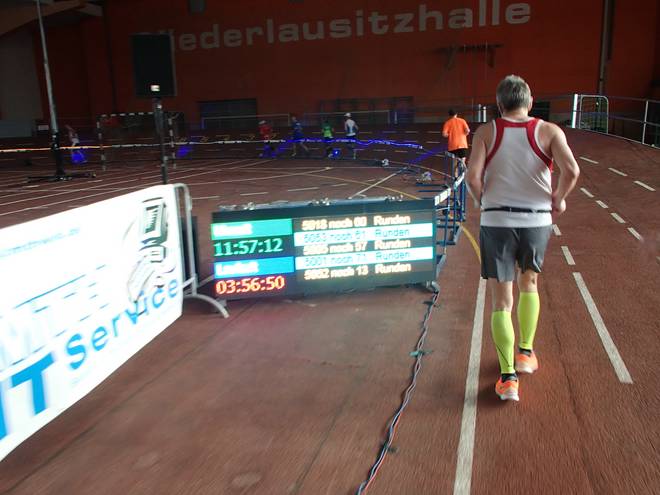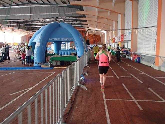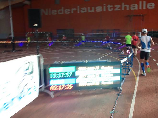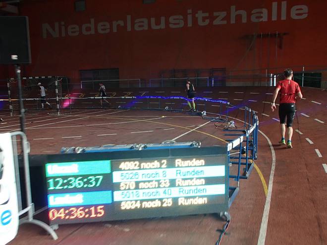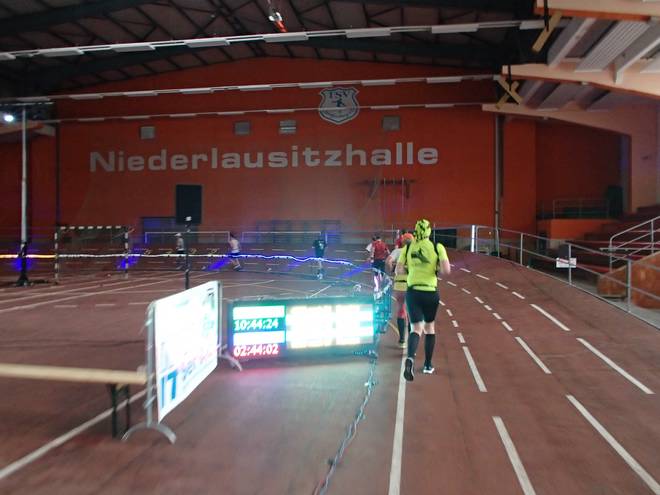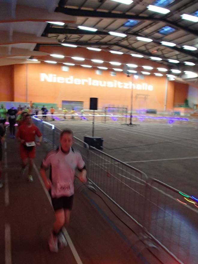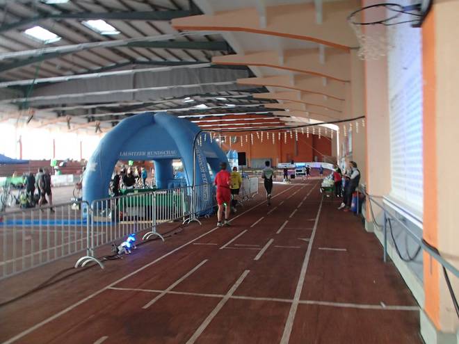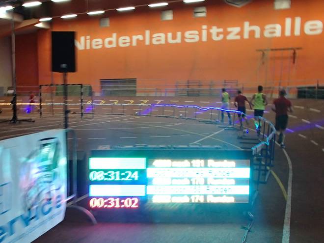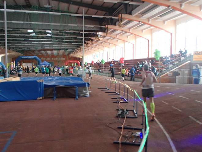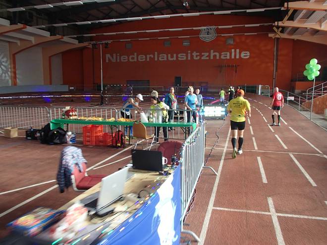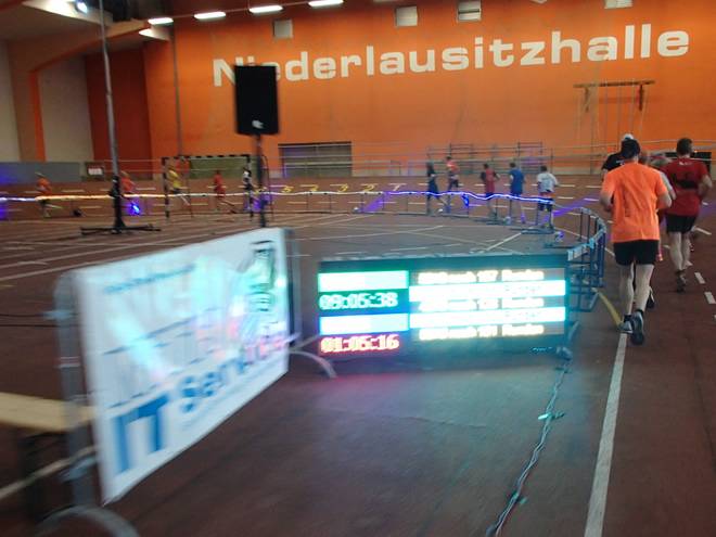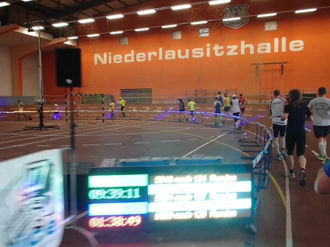 Niederlausitzhalle 07.59 Uhr Es gab auch mindestens einen Läufer, der auch alle drei langen Distanzen unter die Schuhe nahm. Der lief aber auch noch die ganzen kürzeren Distanzen am Samstag und kam auf noch mehr Runden als ich. |