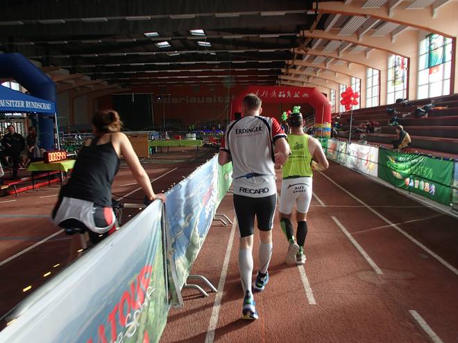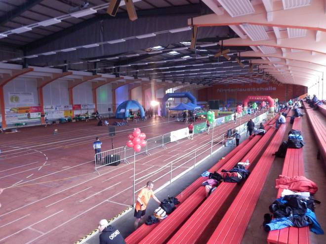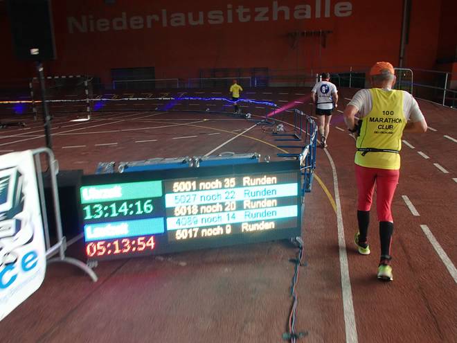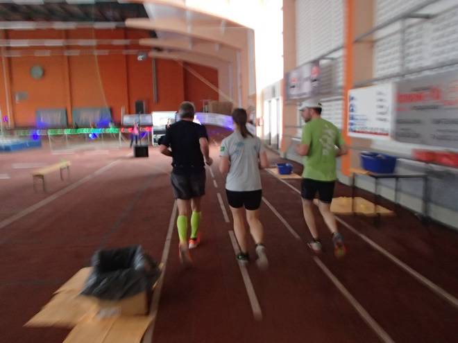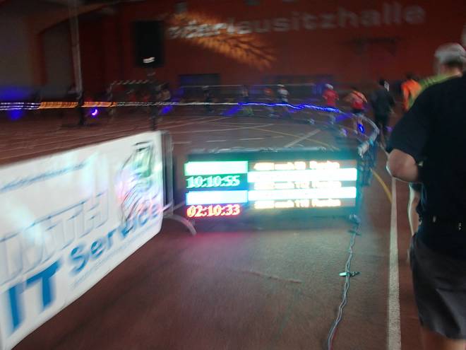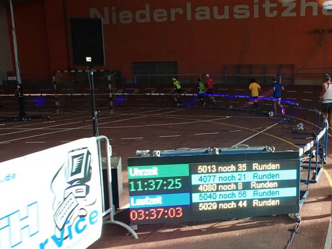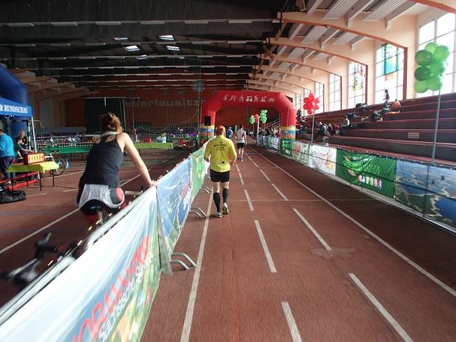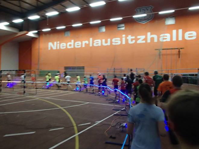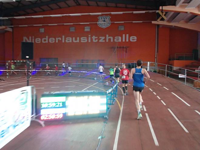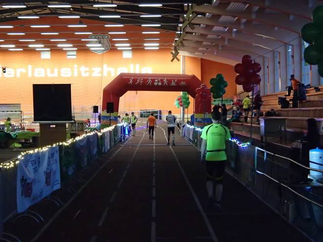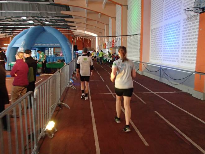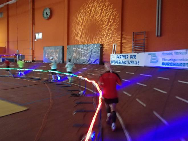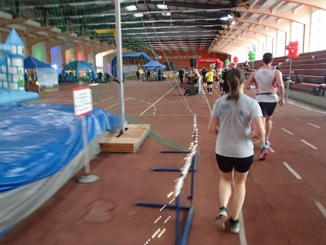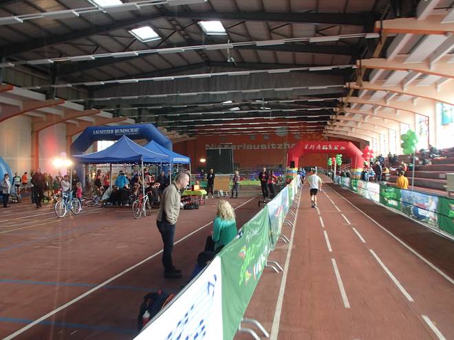 Niederlausitzhalle 07.59 Uhr Es gab auch mindestens einen Läufer, der auch alle drei langen Distanzen unter die Schuhe nahm. Der lief aber auch noch die ganzen kürzeren Distanzen am Samstag und kam auf noch mehr Runden als ich. |