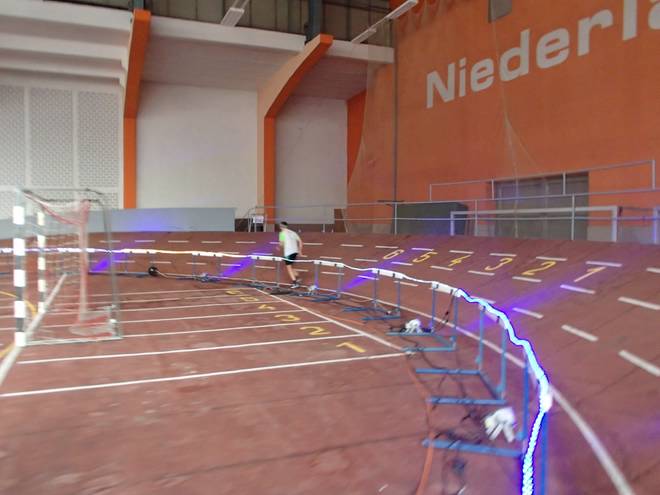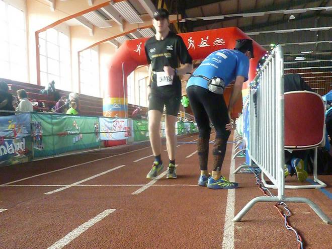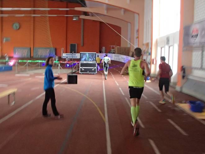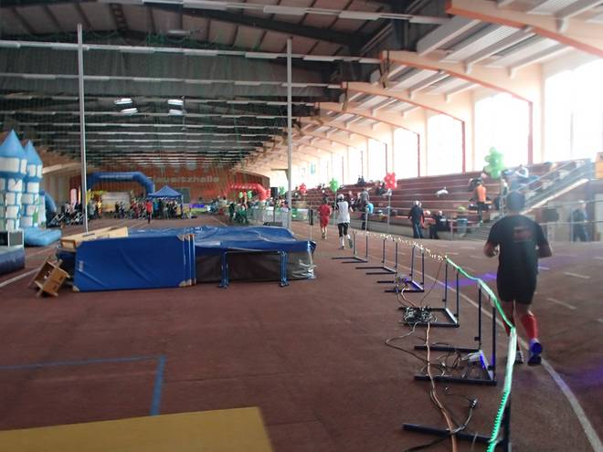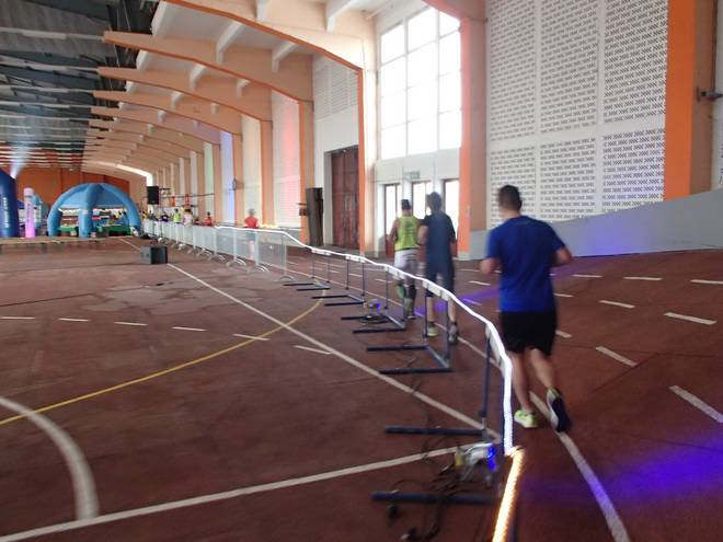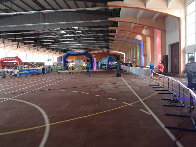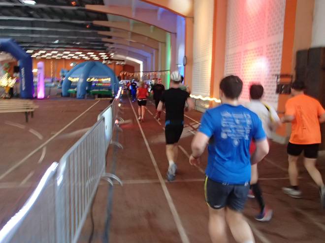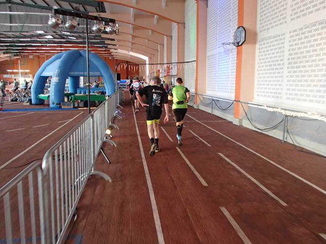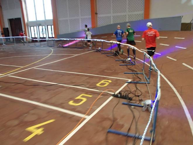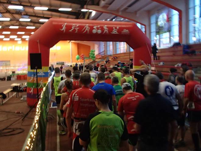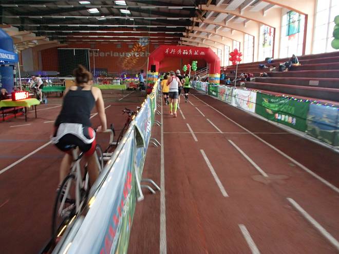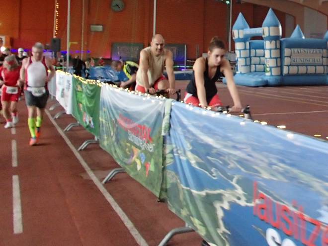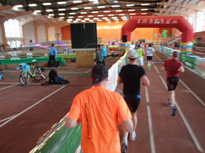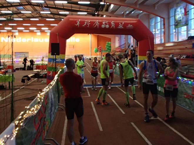 Niederlausitzhalle 07.59 Uhr Es gab auch mindestens einen Läufer, der auch alle drei langen Distanzen unter die Schuhe nahm. Der lief aber auch noch die ganzen kürzeren Distanzen am Samstag und kam auf noch mehr Runden als ich. |