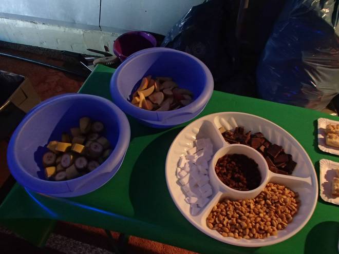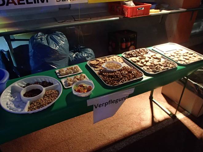 Niederlausitzhalle 07.54 Uhr Der Verpflegungsstand war auch bereit. Gut und lecker gefüllt. Ich schaute vor allem auf das Brot, denn sonderlich viel hatte ich so früh am Morgen nicht runter bekommen. |