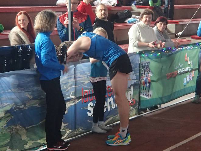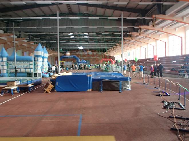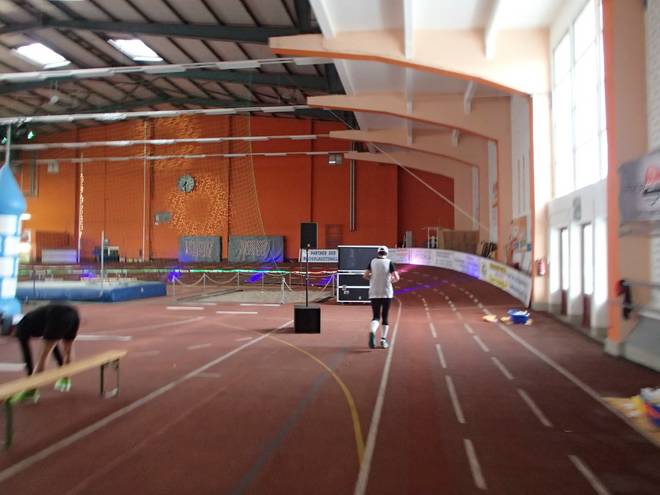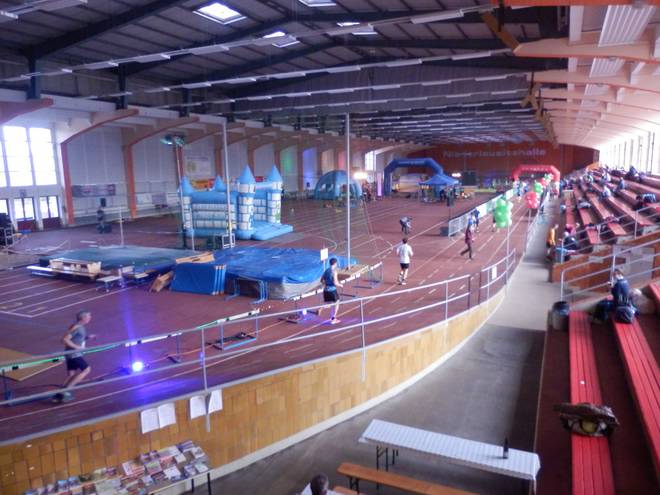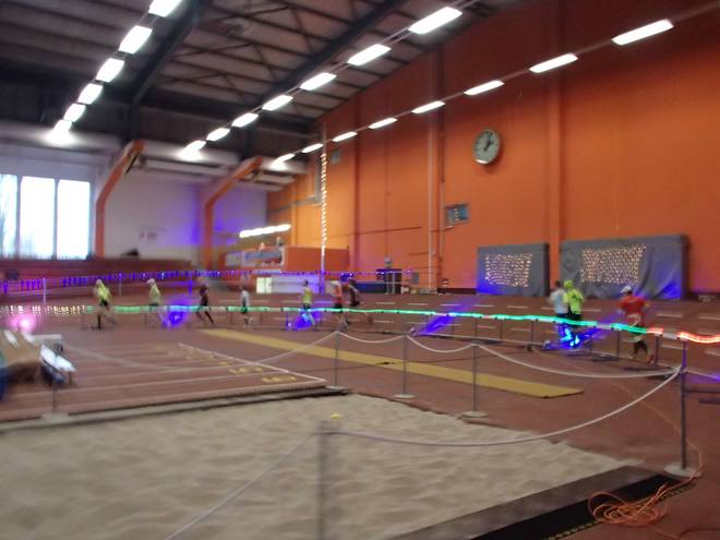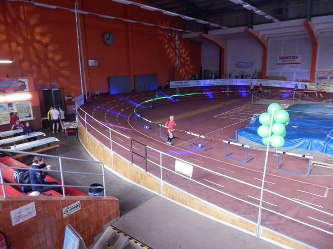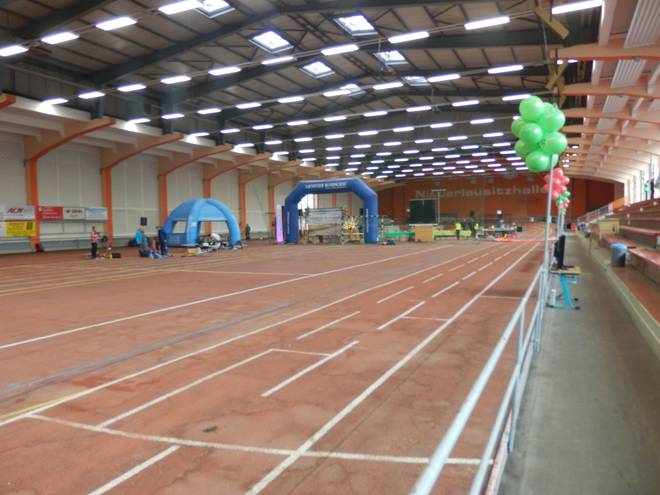 Niederlausitzhalle 14.23 Uhr Auf der Bahn lief derweil der letzte Lauf dieser Veranstaltung. Die 5000 Meter. Vielleicht hätte ich die auch schon geschafft, aber da gab es leider keine Medaille. |