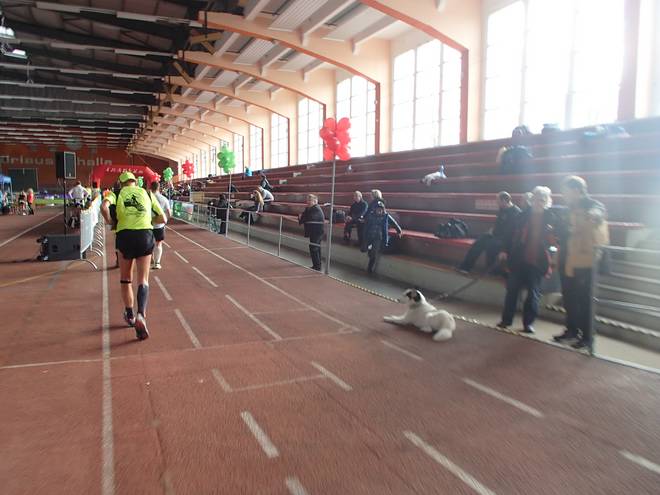 Runde 141 11.58 Uhr / Km 35,2 Eigentlich galt in der Halle absolutes Hundeverbot. Aber der war wenigstens angeleint. |