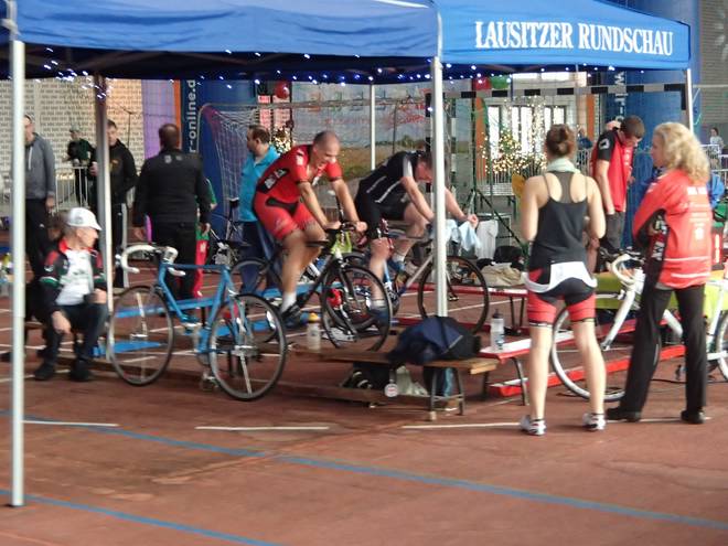 Runde 112 11.01 Uhr / Km 27,95 In der Mitte waren nun die Radfahrer für die 10-Minuten-Hometrainer-Wertung zu bewundern. Wobei Hometrainer etwas irreführend war. Man fuhr auf seinem eigenen Rad. |