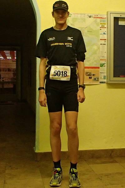 Niederlausitzhalle 07.53 Uhr Viel geschlafen hatte ich nicht, aber dafür war ich relativ fit. Auch die nach dem Unfall bei Km 34 im Marathon am Tags zuvor lädierten Zehen sahen war böse aus, taten aber nicht übermäßig weh. |
