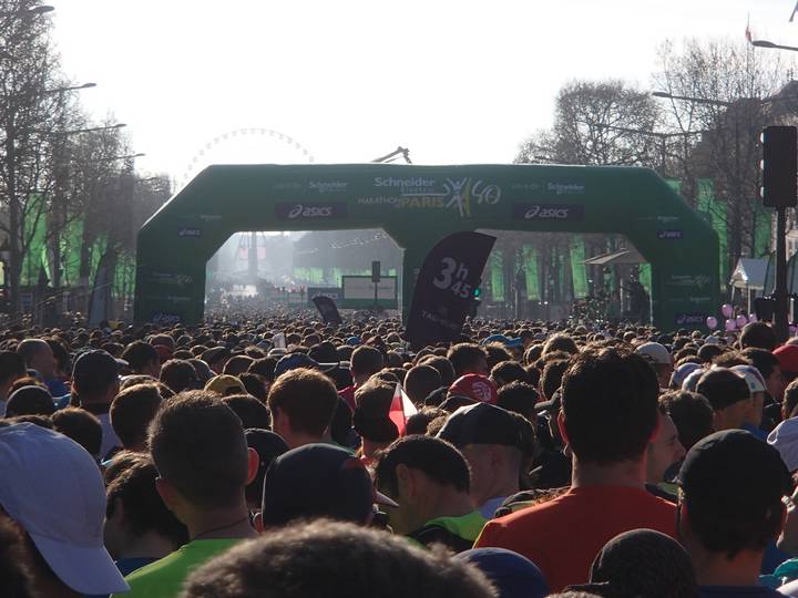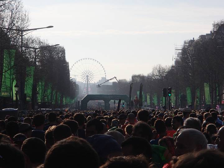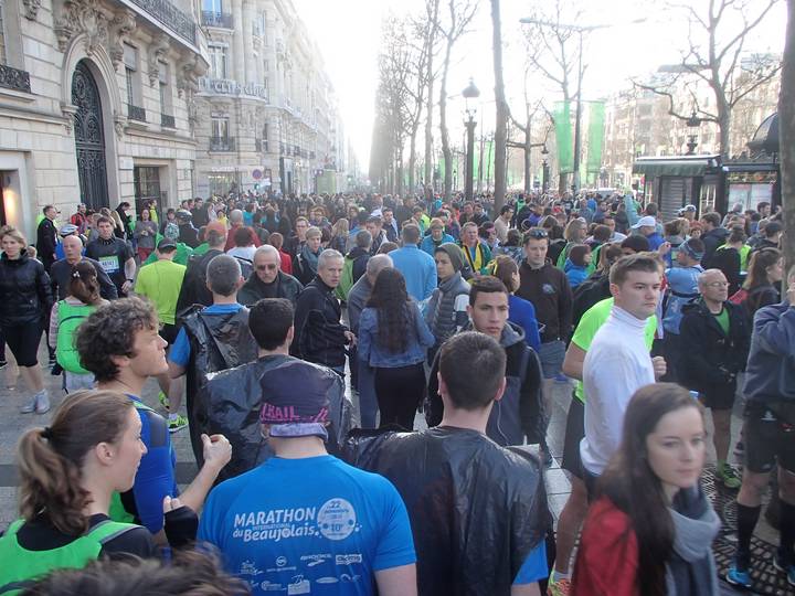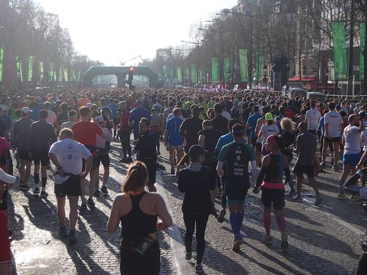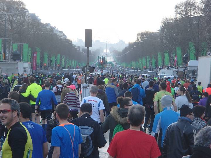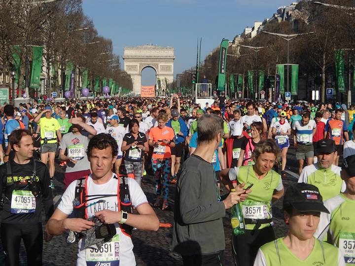Avenue des Champs-Élysées 9.12 Uhr Insgesamt gab es acht Startblöcke. Der Erste war die Elite, dann ging es mit den Zielzeiten 3:00 Stunden im 15-Minuten-Abstand weiter. Der letzte Startblock war für 4:30 Stunden. Bei 6:00 Stunden Zeitlimit. Der letzte Startblock ging um 10.15 Uhr auf die Reise. Also 90 Minuten nach den Profits. |