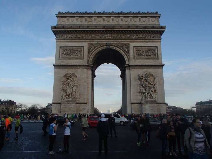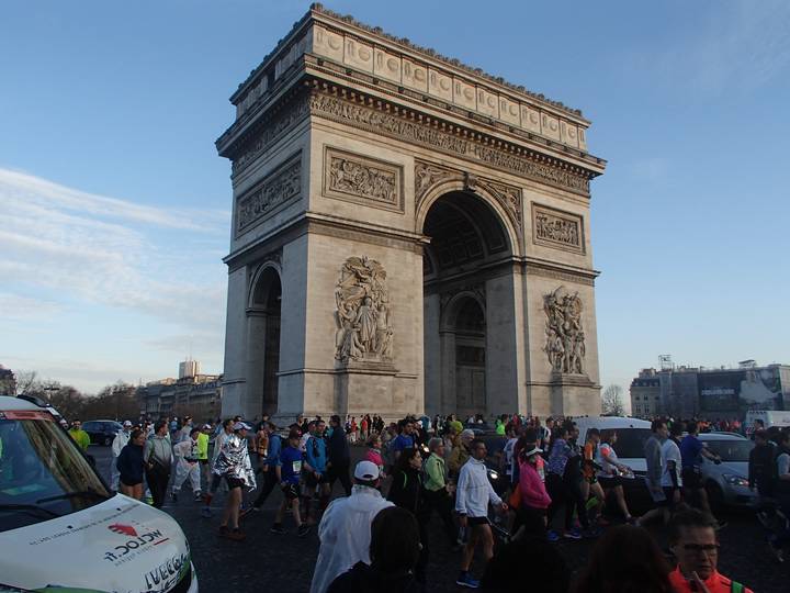 Arc de Triomphe Place Charles de Gaulle 8.19 Uhr Abgesperrt war der Place Charles de Gaulle nicht, aber die Läufer nahmen zumeist trotzdem den kurzen Weg quer durch den Auto-Verkehr. Da war vielleicht ein Gehupe. |