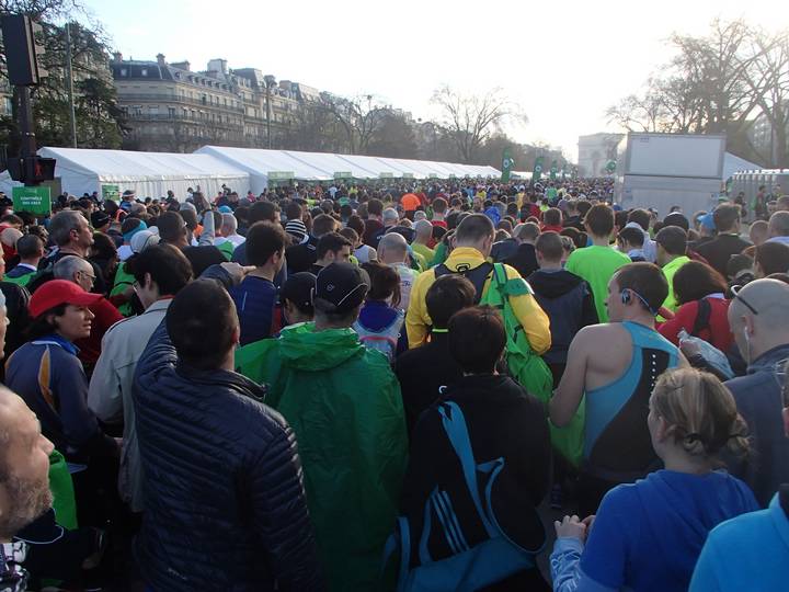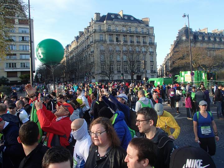 Avenue des Champs-Élysées 9.15 Uhr So um die 8000 Läufer dürften im Startblock gewesen sein. Schwer zu schätzen. Insgesamt war immer von 57000 Läufern die Rede, aber da zählten auch die Kinderläufe und der Breakfast-Rum am Vortag mit. Hier am Start standen wohl so 43000 Läufer. Es reicht, um der größte Marathon in Europa zu sein. |