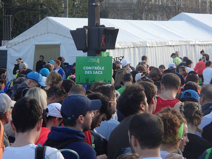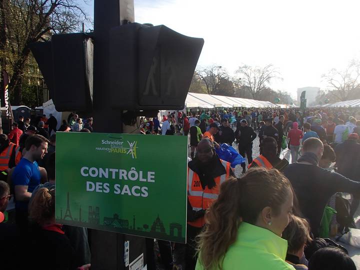 Avenue Foch Avenue de Malakoff 8.43 Uhr Das hatte ich bei einem Marathon auch noch nicht erlebt. Eine Personen- und Taschenkontrolle. Naja... im Gegensatz zum Flughafen durfte man hier aber seine Getränke mitnehmen. |