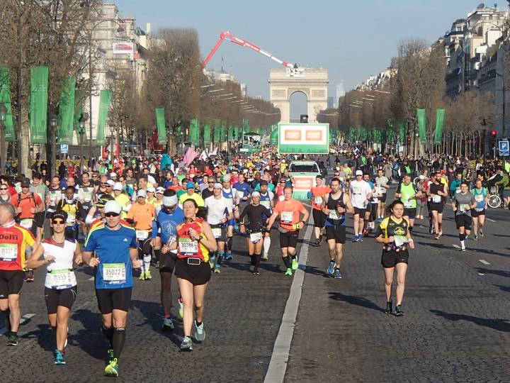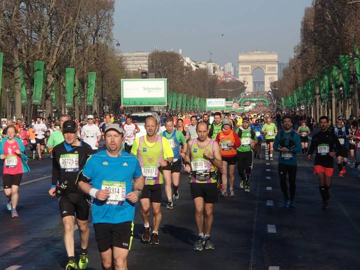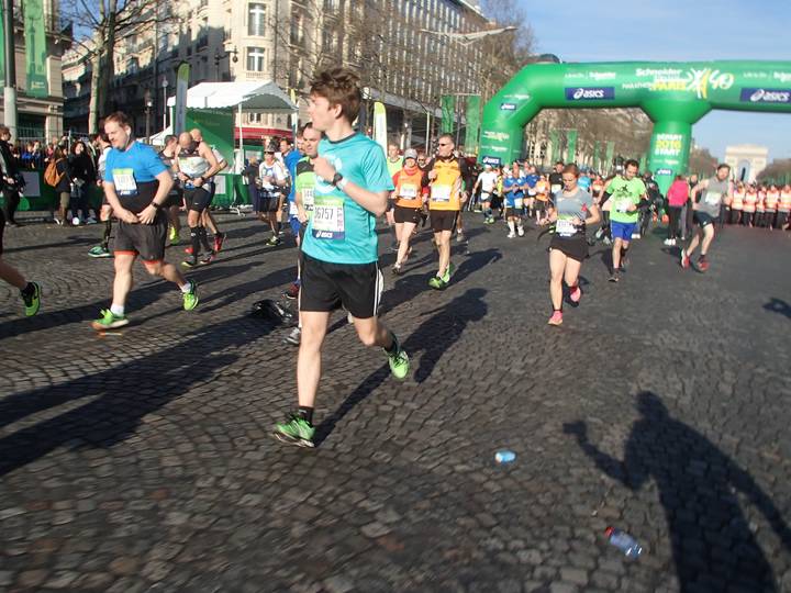Avenue des Champs-Élysées 9.34 Uhr / Km 0,9 Und immer wieder der weite Rückblick über das riesige Starterfeld mit dem Arc de Triomphe im Hintergrund. |