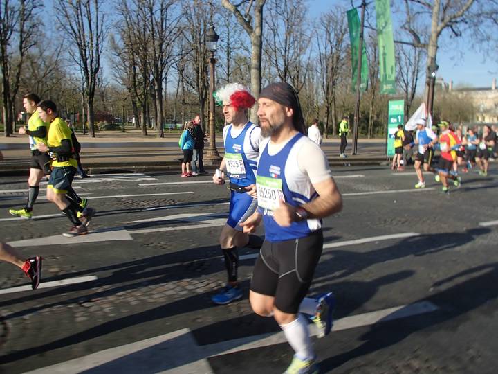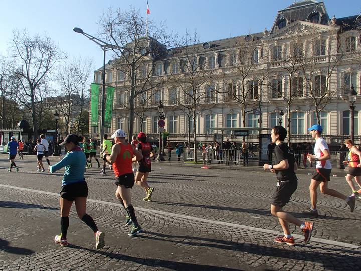 Avenue des Champs-Élysées 9.30 Uhr / Km 0,3 Gleich am Anfang lief man auf Kopfsteinpflaster. ich wurde schon vorgewarnt, daß der Paris Marathon schon deswegen nicht so einfach zu laufen sein. |