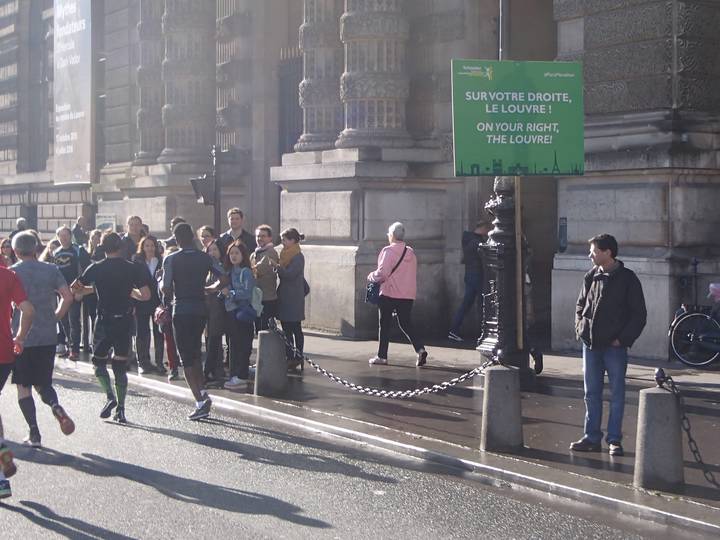 Rue de Rivoli Musée du Louvre 9.42 Uhr / Km 2,3 Nette Idee, solche Hinweise aufzuhängen für alle die, die es tatsächlich nicht wußten. Also nun rechts der Louvre. |