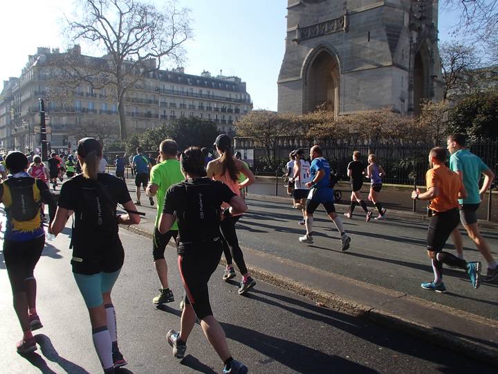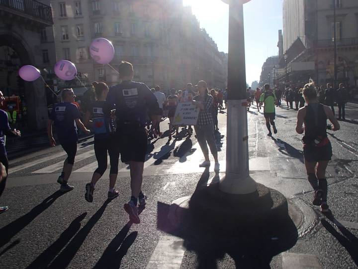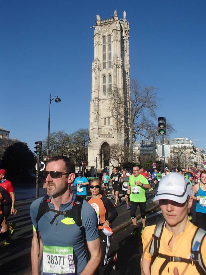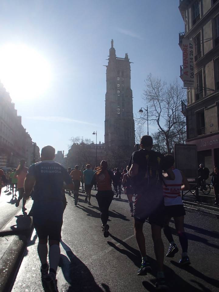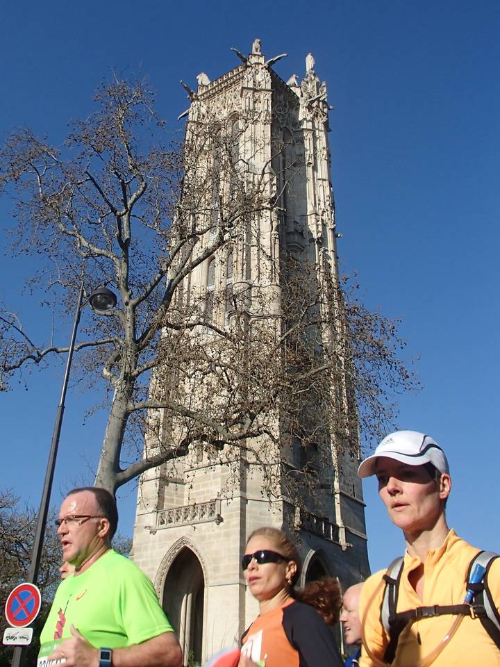 Rue de Rivoli Tour Saint-Jacques 9.47 Uhr / Km 3,2 Mit der Sonne von vorne gelangen die Fotos nach hinten besser. Logisch. Die waren im Laufen allerdings auch schwieriger zu machen. |