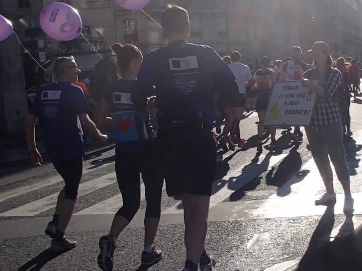 Rue de Rivoli 9.44 Uhr / Km 2,7 "Touch if you are a sexy runner". Ich lief auf der falschen Seite dran vorbei. Ein Jeder darf nun spekulieren, welche das war. |