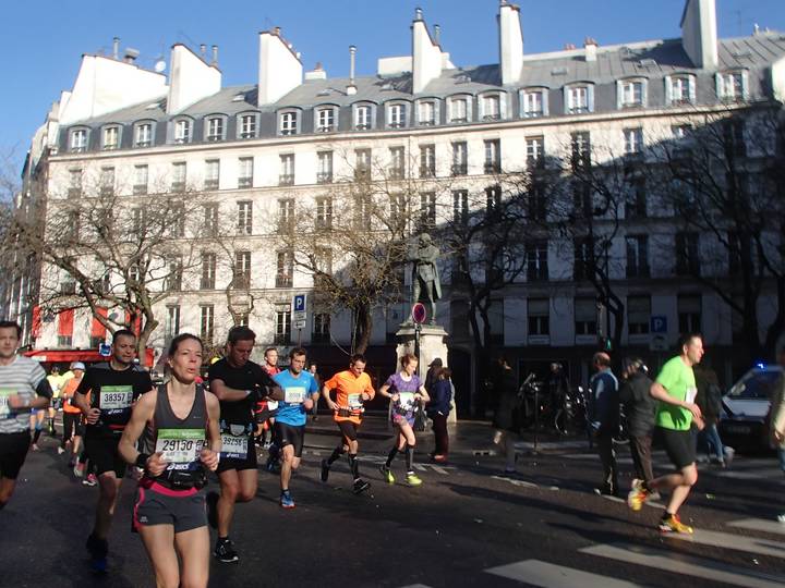 Rue du Faubourg Saint-Antoine 9.59 Uhr / Km 5,4 Aber mit der Enge war es vielleicht gar nicht falsch, denn so wurde mein doch etwas hohes Tempo ein wenig eingebremst. |