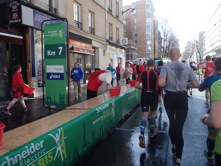 Rue de Reuilly 10.07 Uhr / Km 7,0 Jeweils in der Mitte zweier Verpflegungsstände gab es noch Wasser-Stand für Schwämme. Aber nichts zu trinken. Okay... rein theoretisch konnte man das Wasser schon trinken, aber ich würde es nicht empfehlen. |