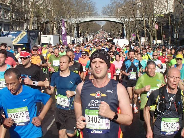 Avenue des Champs-Élysées 9.30 Uhr / Km 0,2 Auf der breiten Avenue des Champs-Élysées hatte man gleich zu Beginn sehr viel Platz zum Laufen. Da kam man recht schnell in seinen Rhythmus |