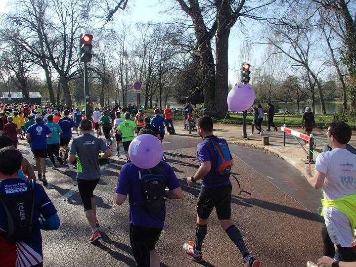 Rue de Rivoli 9.44 Uhr / Km 2,7 Lila Ballons. Im Feld gab es die reichlich und viele davon waren auch mit Zeitläufern verknotet. Wenn allerdings schon mein 3:45-Stunden-Block gut eine Viertelstunde zum Überqueren des Starts benötigte, was bedeutete die Ballon-Zeit dann für mich? |