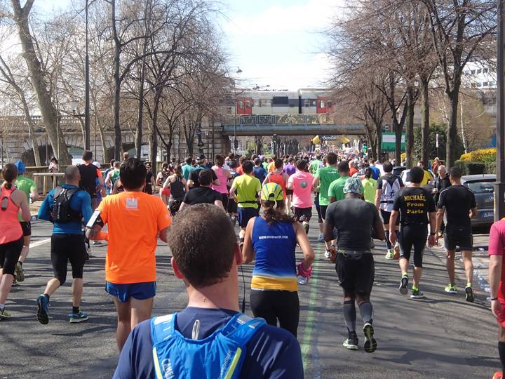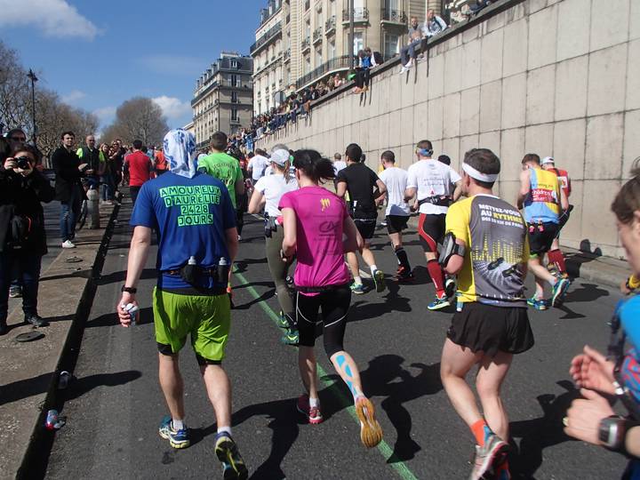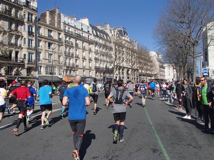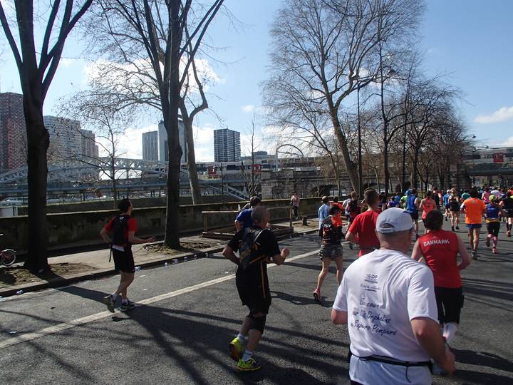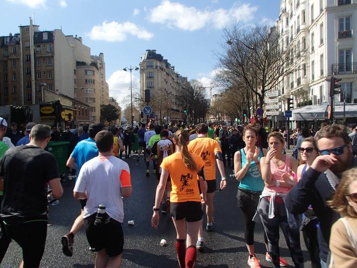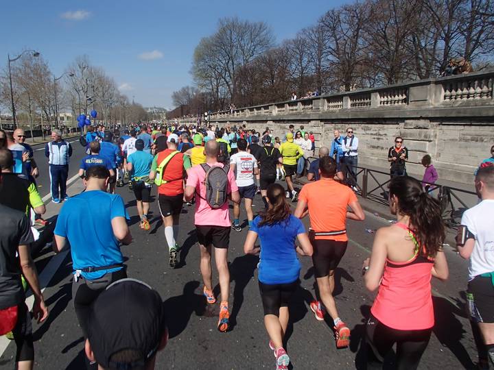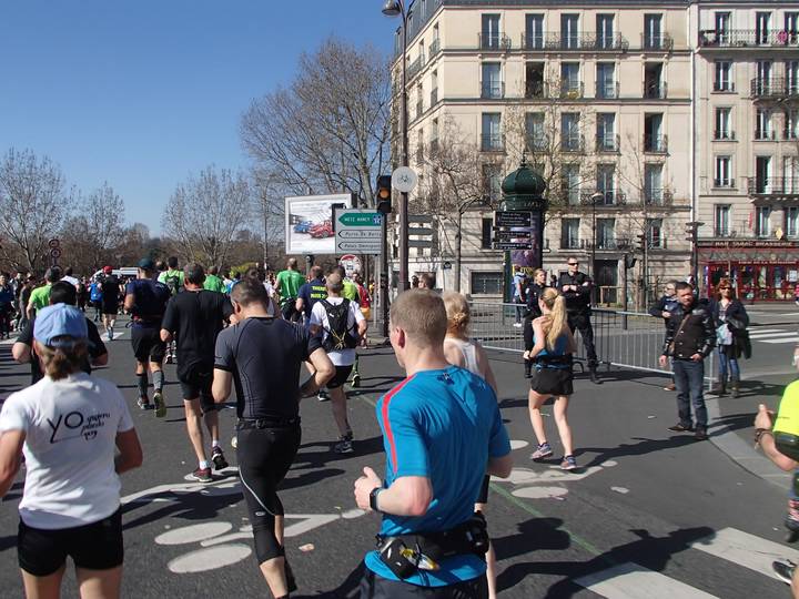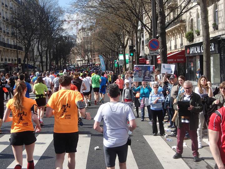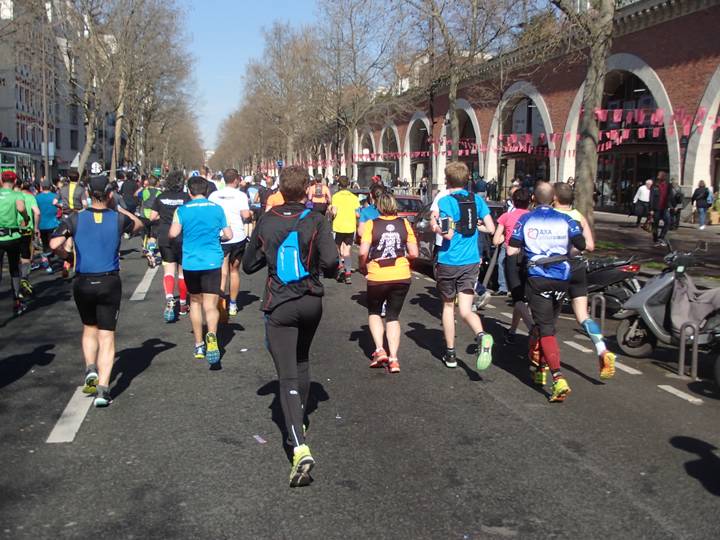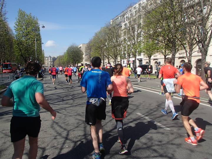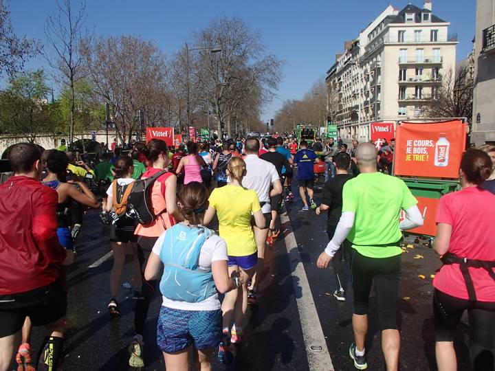 Boulevard Bourdon 11.38 Uhr / Km 23,0 Das war schon eher das Bild, was sich einem bot: Läufer dicht an dicht. |