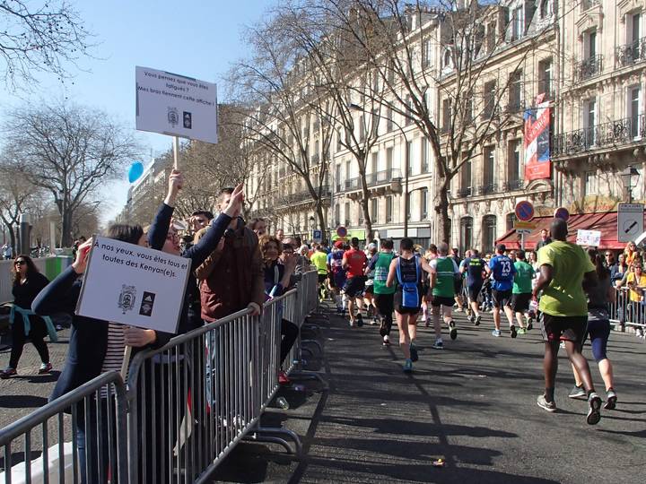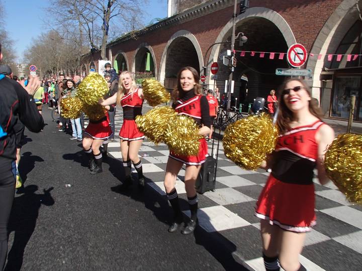 Avenue Daumesnil 11.28 Uhr / Km 21,2 Es war ja ansatzweise nun etwas mehr Platz auf der Straße. Außerdem konnte man auch eine Weile rechts hinter den Zuschauern laufen. |