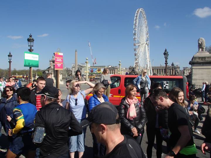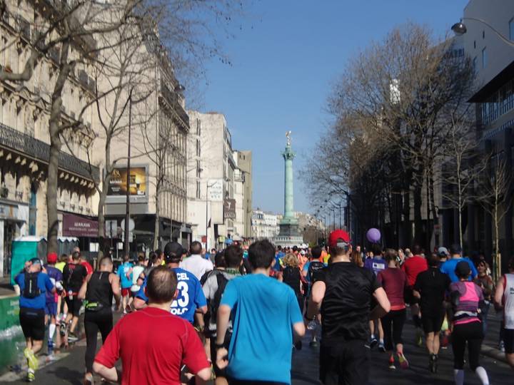 Place de la Bastille 11.35 Uhr / Km 22,4 Auf der anderen Seite der Säule liefen sogar noch Läufer. Kilometer 5 bei 2:50 Stunden brutto. Selbst wenn wir dem letzten Block 20 Minuten Zeit für den Start geben (10.05 Uhr) waren das immer noch 1:10 Stunden netto. |