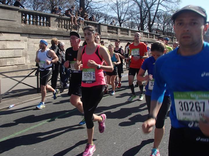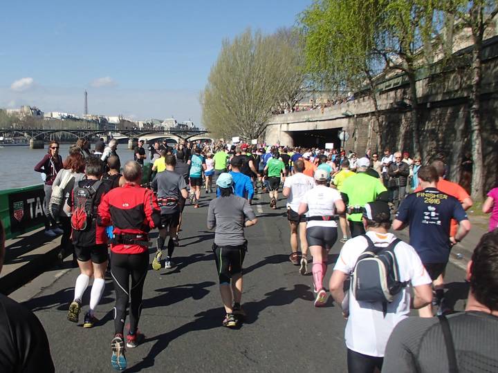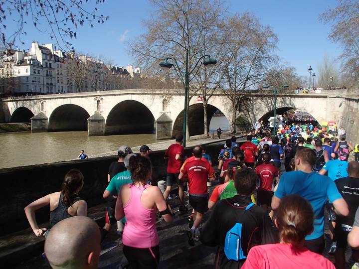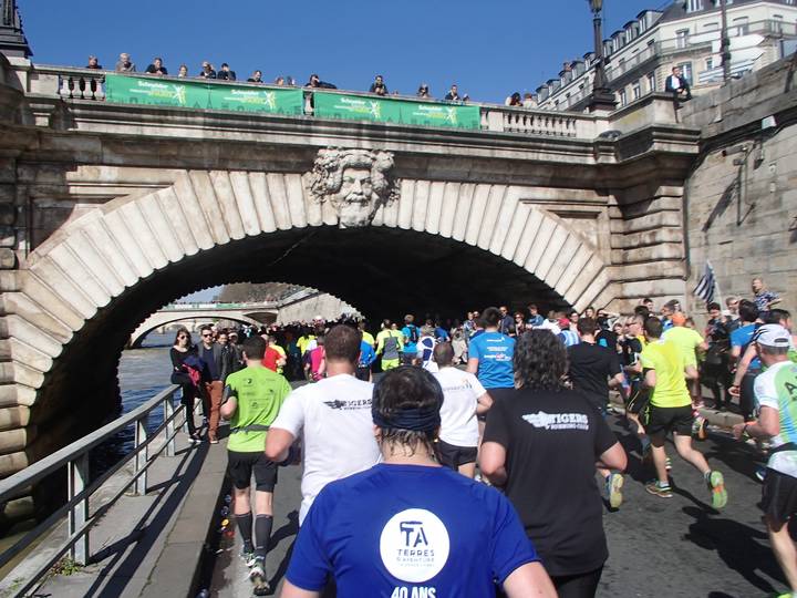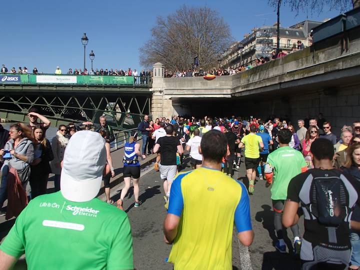 Quai des Tuileries 11.59 Uhr / Km 26,6 Die Steigung hinter dem Tunnel tat weh. gerne wäre ich ja in meinem üblichen Schritt die Steigung rauf gelaufen, aber da war ja kein Platz. |