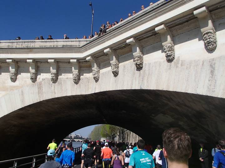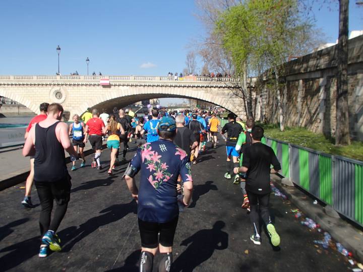 Voie Georges Pompidou Pont Louis Philippe Seine 11.46 Uhr / Km 24,3 Das war schön. Da vergaß man auch eine Weile, daß man in der Masse von Läufern nicht voran kam. |