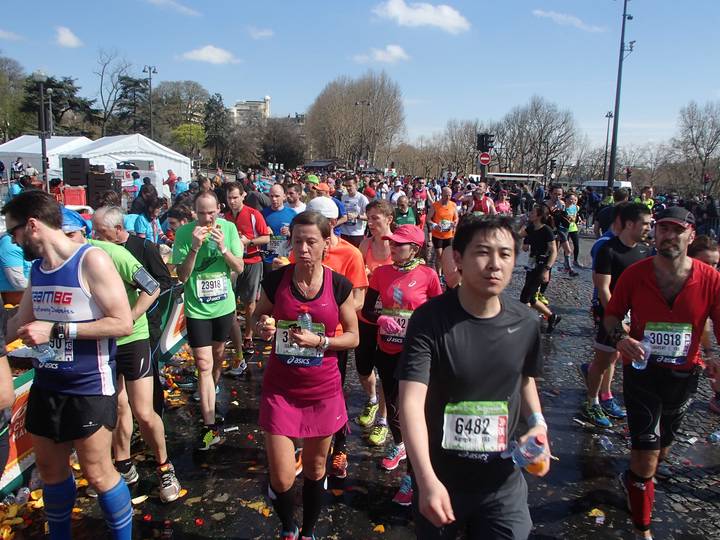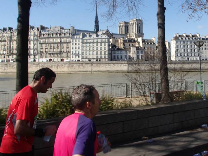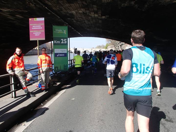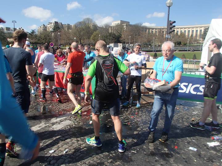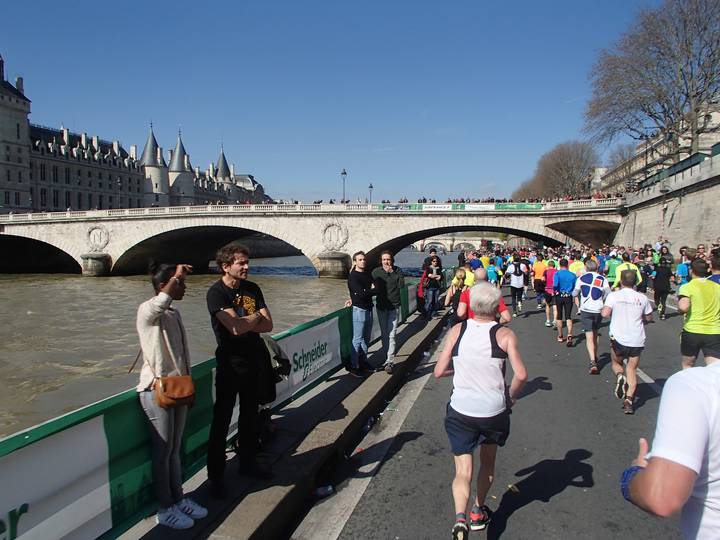 Quai Henri IV 11.44 Uhr / Km 24,0 Es war zum Kotzen (wäre Dank der Wasser-Obst-Kälte-Kombi ganz einfach gewesen). Jeder Provinz-Marathon (das ist nicht abwertend gemeint) bietet bessere Verpflegung als das hier. |
