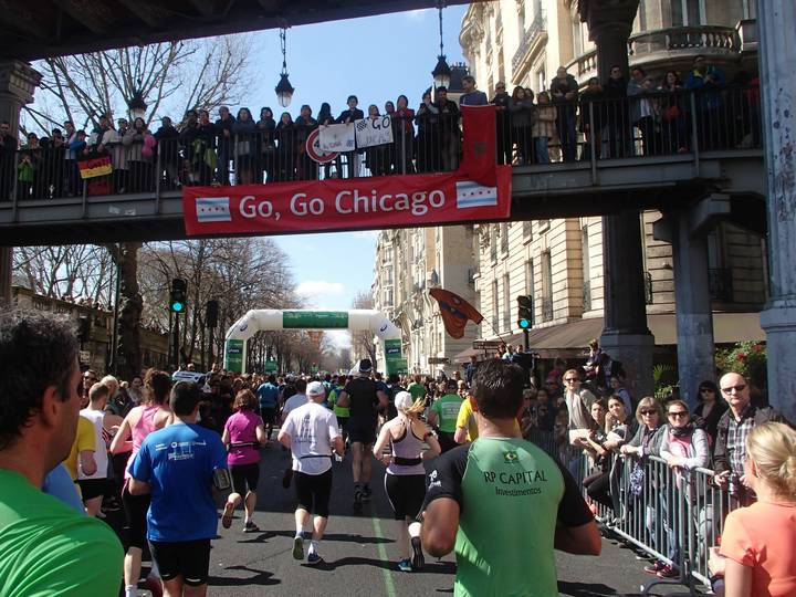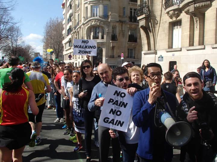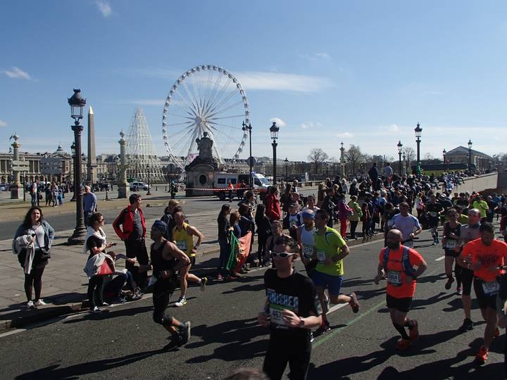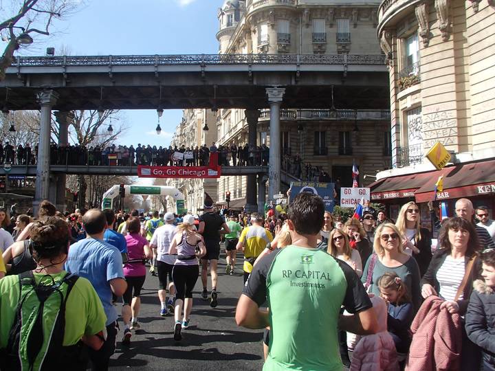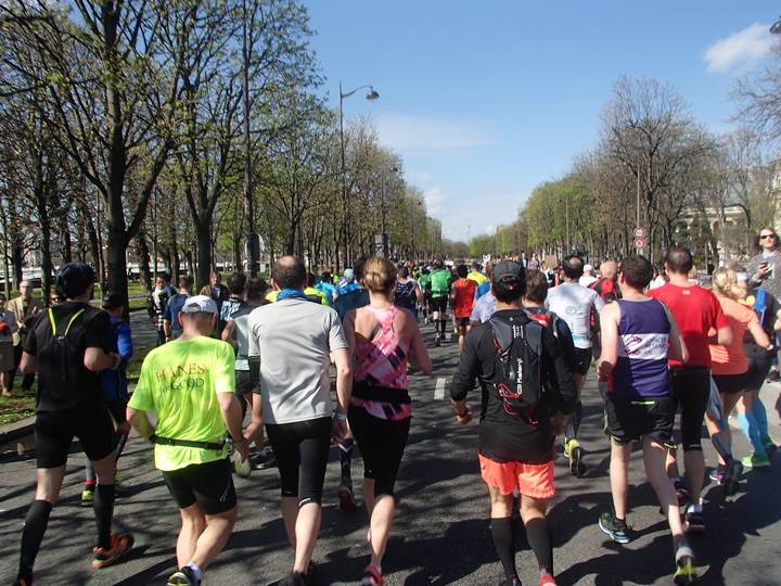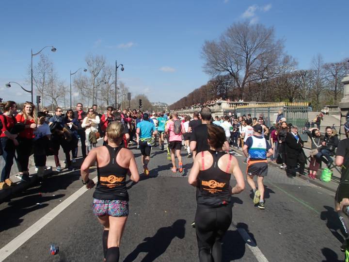 Cours la Reine 12.04 Uhr / Km 27,3 Ich wollte nicht aufgeben. Im Zick-Zack kämpfte ich mich durch das Feld. Auch wenn die zu neunt nebeneinander liefen. |