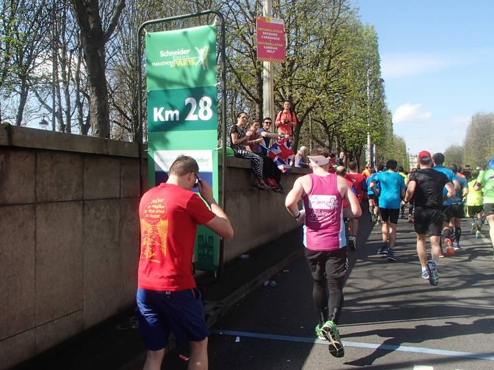 Cours la Reine 12.08 Uhr / Km 28,0 Fast genau 2:40 Stunden auf der Uhr. Macht dann 4:00 Stunden bei Kilometer 42 und dann noch 195 Meter. |
