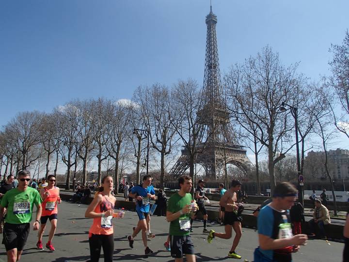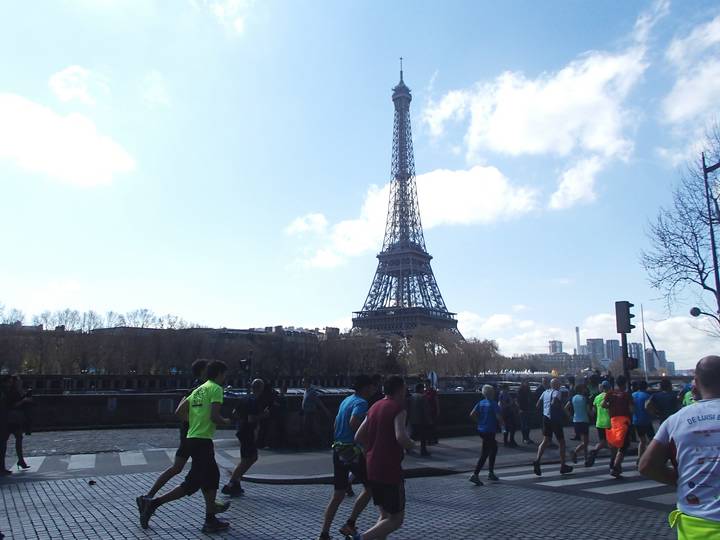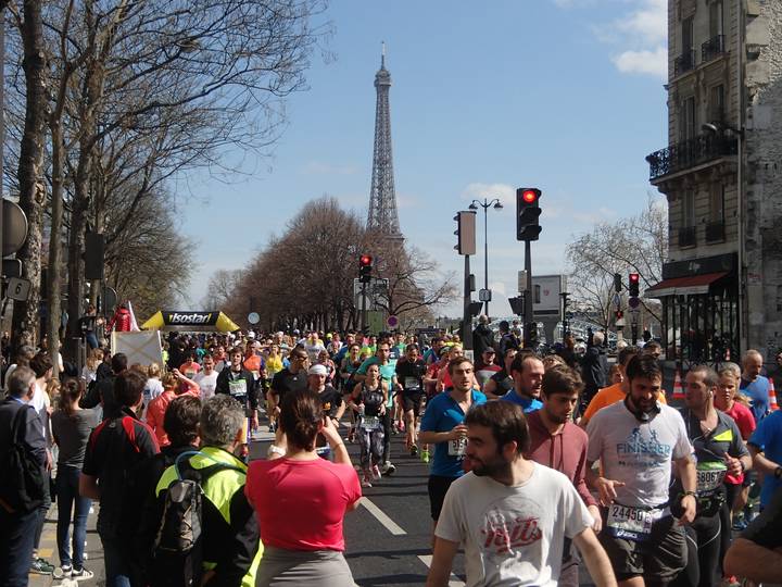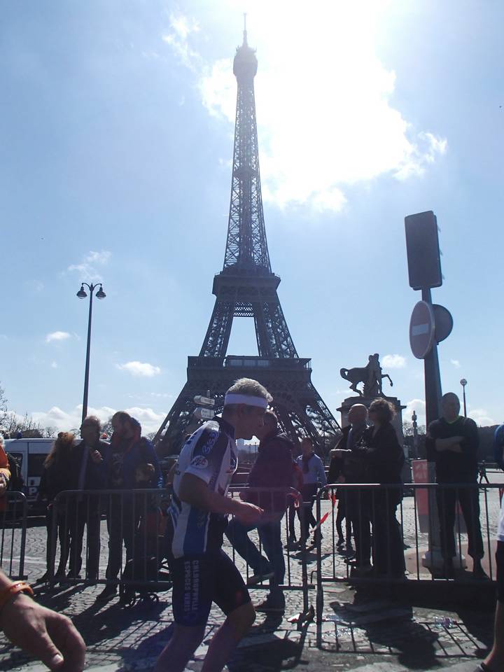 Avenue de Versailles Tour Eiffel 12.29 Uhr / Km 31,0 Und der letzte Blick zurück zum Eiffelturm. Jetzt waren es noch 11,2 Kilometer bis ins Ziel. Das wäre doch gelacht, wenn ich nicht auch in Frankreich einen Marathon würde finishen können. |