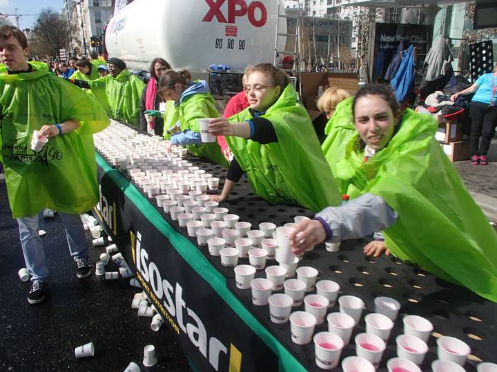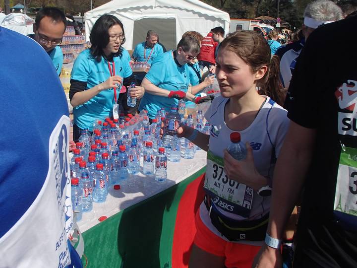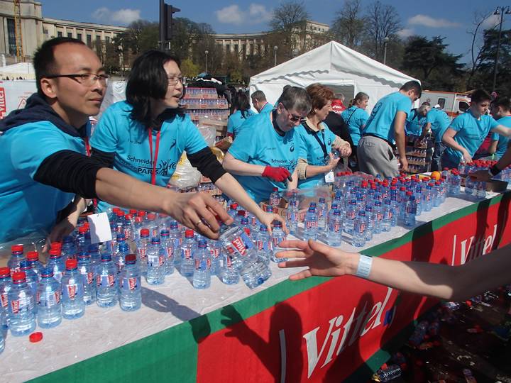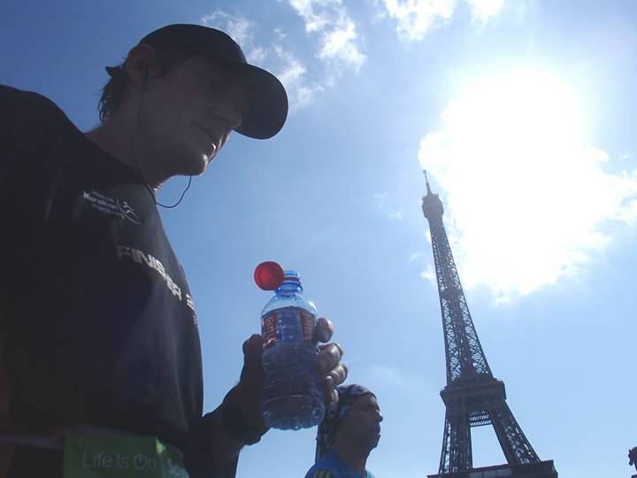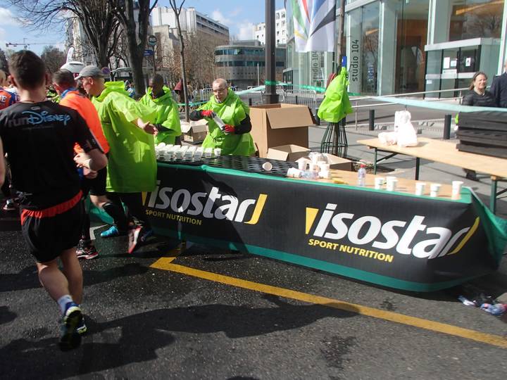 Avenue du Président Kennedy 12.27 Uhr / Km 30,7 Und dann gab es tatsächlich doch noch etwas anderes als Wasser. Das war zwar kein offizieller Stand, sondern von Isostar aufgebaut, aber das war mir da sowas von egal. Aufgebaut war das Ganze direkt vor dem Eingang von Radio France. |