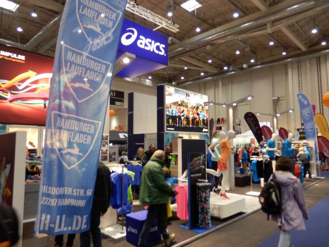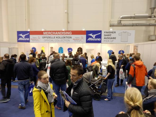 Hamburg Messe Halle A4 Selbst am offiziellen Stand mit dem Hamburg-Marathon-Artikeln kaufte ich kaum ein. |