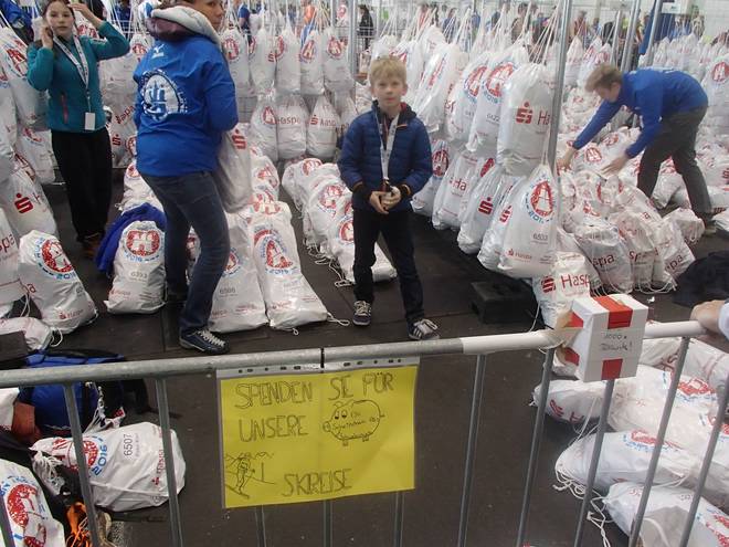 Messe Hamburg Halle A2 12.51 Uhr Spenden war nicht so einfach. Das Geld war in der Jacke und die war im Beutel. Also erst einmal den Beutel auspacken und Geld holen und dann zum Spenden. Ehrensache. |