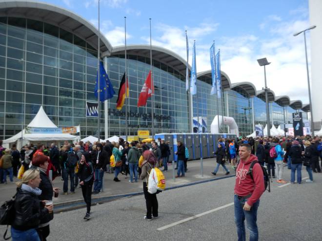 Messe Hamburg Halle A2 12.51 Uhr Nun ging es erst einmal zu dem Kleiderbeuteln. Es war ja nicht so warm, als daß an mit den nassen Klamotten ewig würde warm bleiben. |