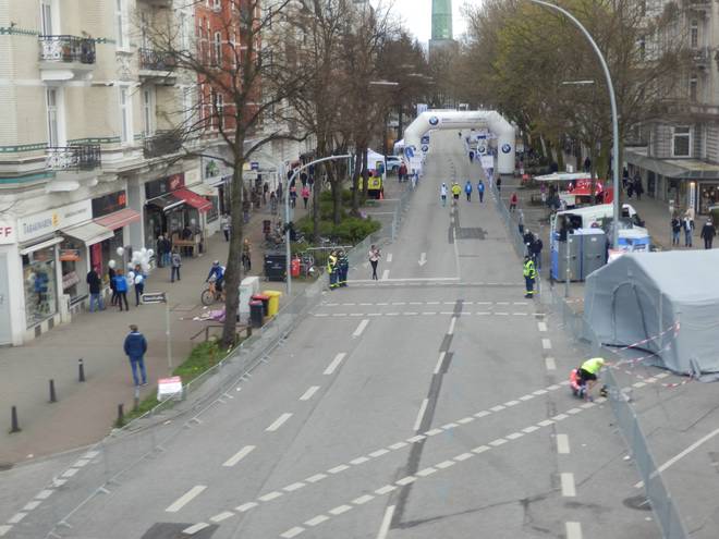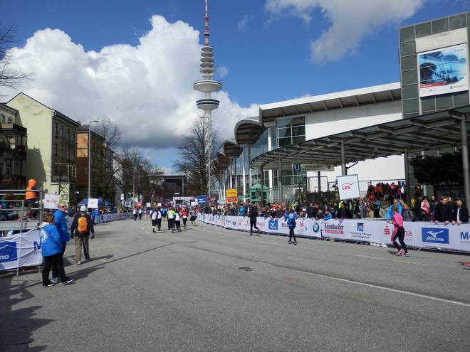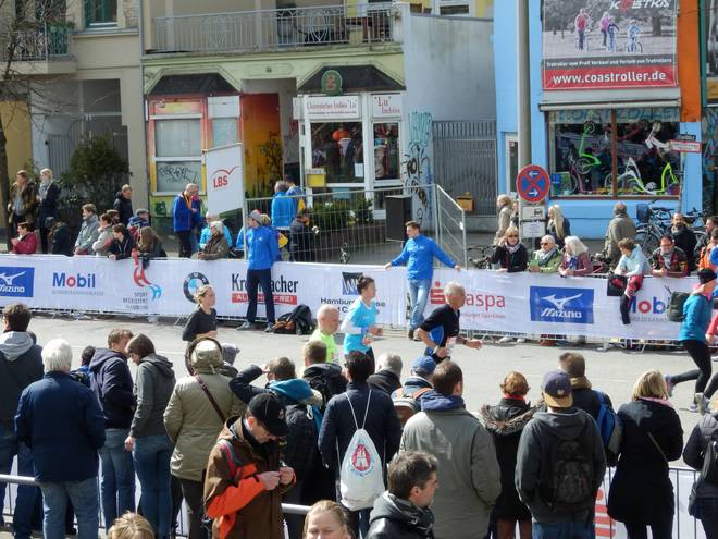 Karolinenstraße 13.56 Uhr Nach nur 23 (!) Minuten stand ich dann tatsächlich an der Strecke und nicht einfach nur zufällig irgendwo hinter der Tribüne mit Blick auf die einlaufenden Finisher. |