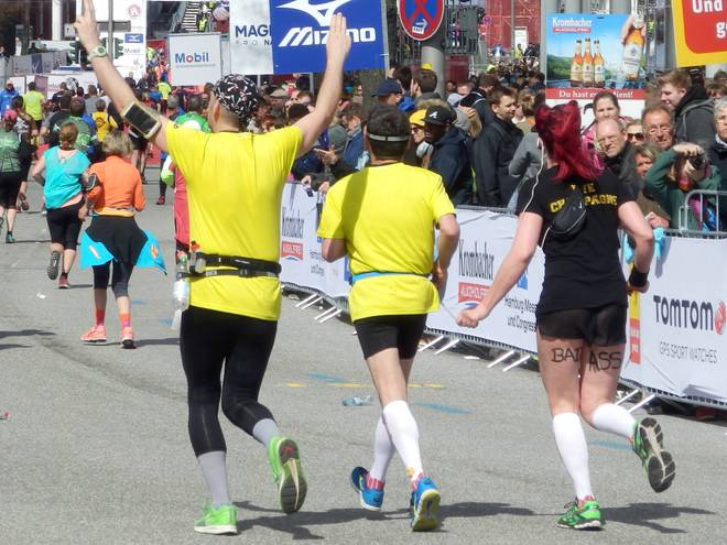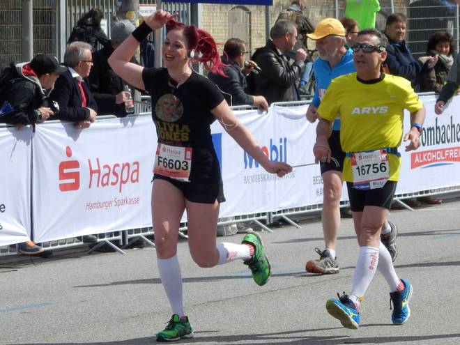 Karolinenstraße 14.09 Uhr Hier kam das wohl seltsamste Paar des Marathons. Links mit der Startnummer F6603 lief die Hamburger Burlesque-Ikone Eve Champagne, rechts daneben mit der 16756 der blinde Extremsportler Jeffrey Norris. Beide mit einem Band verbunden. |
